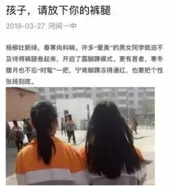 去年,河北沧州河间市第一中学为了纠正学生们这种不惜损伤身体追逐“时尚”的做法,每天检查学生是否露脚踝,并在学校微信公众号中发布一篇《孩子,请放下你的裤腿》的文章,受到广大家长的赞同和支持。