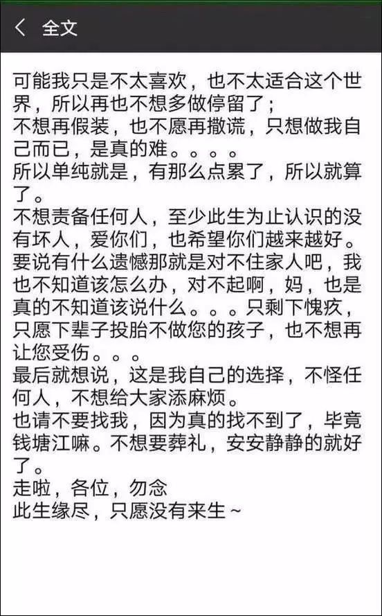 “可能我只是不太喜欢,也不太适合这个世界,所以再也不想多做停留了。不想再假装,也不愿再撒谎,只想做我自己而已,是真的难。”