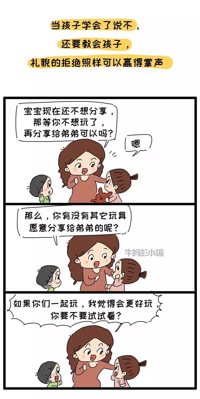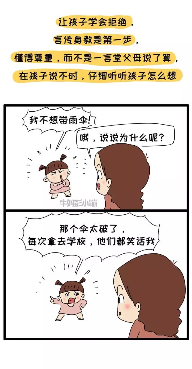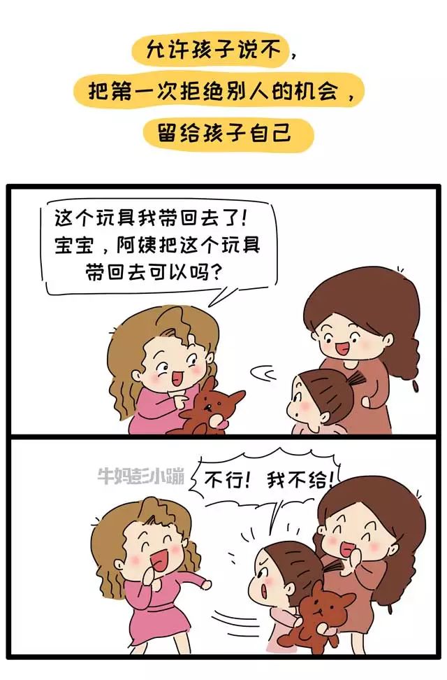 “台上一分钟,台下十年功”,看似简单的拒绝,前期需要大量的投入:需要父母给孩子足够的安全感,帮助孩子建立自信;从家里开始,培养孩子的物权意识,画笔是孩子的、口红是妈妈的、篮球是爸爸的……其他人想要用,需要征得本人的同意,如果不同意可以直接拒绝……