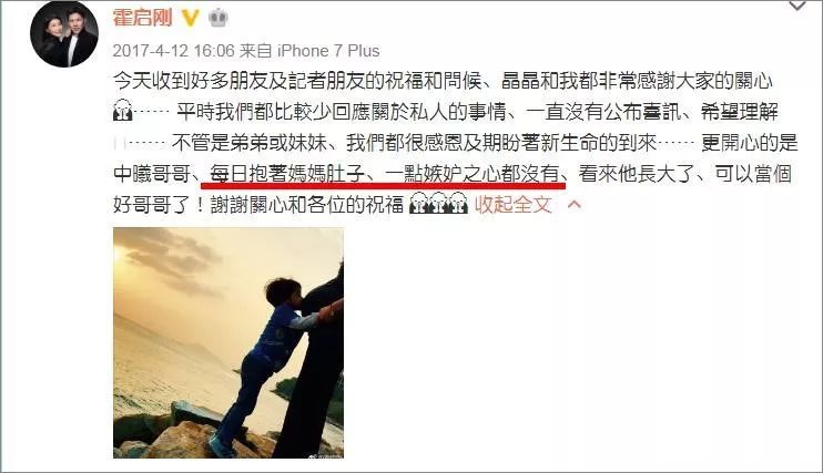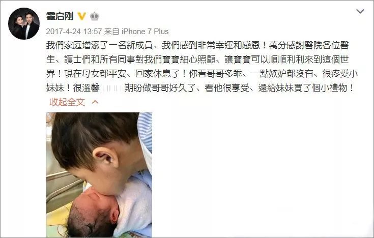 霍启刚发微博说:“你看哥哥多乖,一点嫉妒都没有,很疼爱小妹妹,很温馨,期盼做哥哥好久了。”