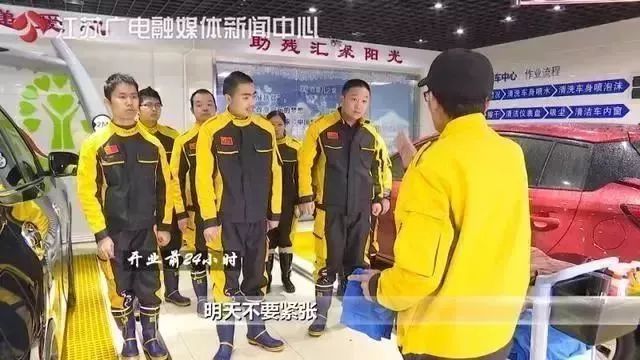 虽然“喜憨儿”他们行动比较慢,但是好在他们人比较多,曹军把他们5个人编成一组,这样车一来,大家一起上,分工协作、各司其职,洗车速度也不慢。