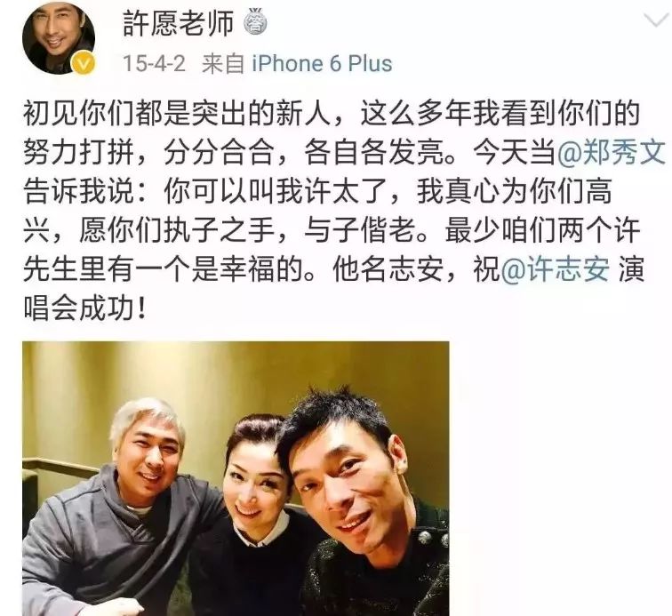 15年,因为两人的前辈许愿老师的这条微博,两个人终于迎来了公众眼里的“花好月圆”: