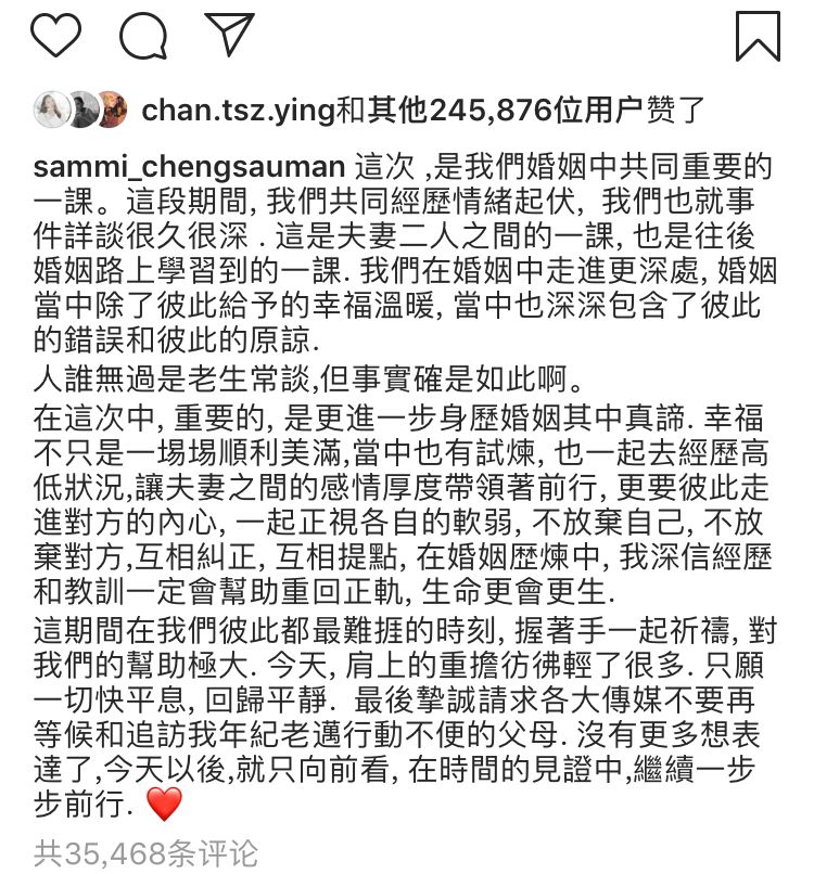 在声明里,郑秀文说,这是两个人婚姻中重要的一课,也已经对这件事谈了很久很深。