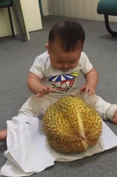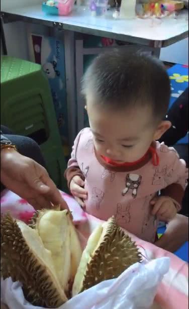 未经世事的宝宝总是对世间一切的事物充满了好奇,尤其是还在牙牙学语的时候,看到什么都想碰一下摸一下,很多家长也会拿来来一下宝宝从来没见过的新奇玩意儿让他们玩耍,培养孩子敢于探索新事物积极性。网上就有这么一位突发奇想的家长,把榴莲放到宝宝面前,没想到宝宝的可爱举动让家长都笑疯了。