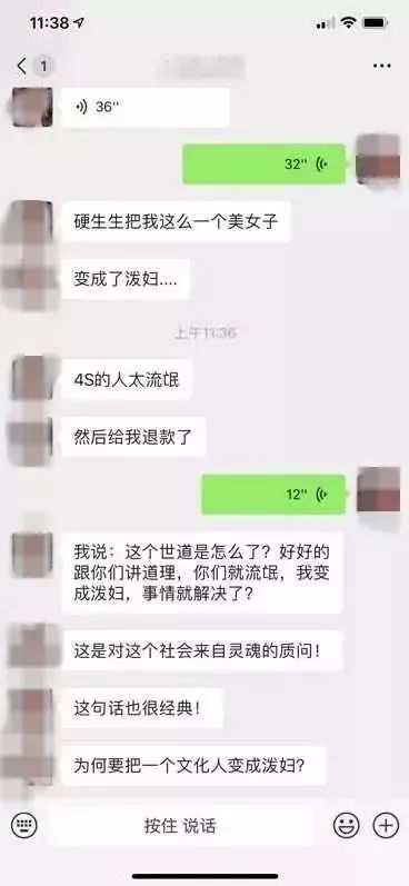 期间,女车主聊天记录流出,她说自己并不开心,“硬生生把我一个美女子,逼成了泼妇”,并对社会发出了来自灵魂的拷问:“为何要把一个文化人变成泼妇?”