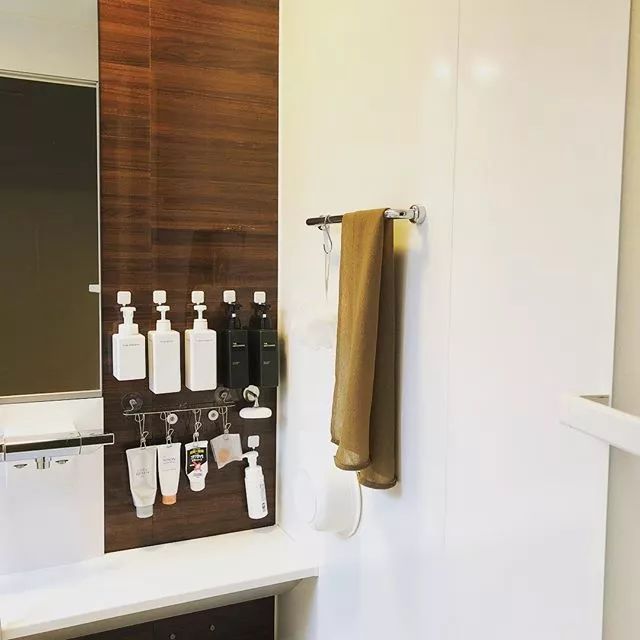 对于卫生间里沐浴露、洗面奶等瓶瓶罐罐的整理,rumi有自己独特的技巧——