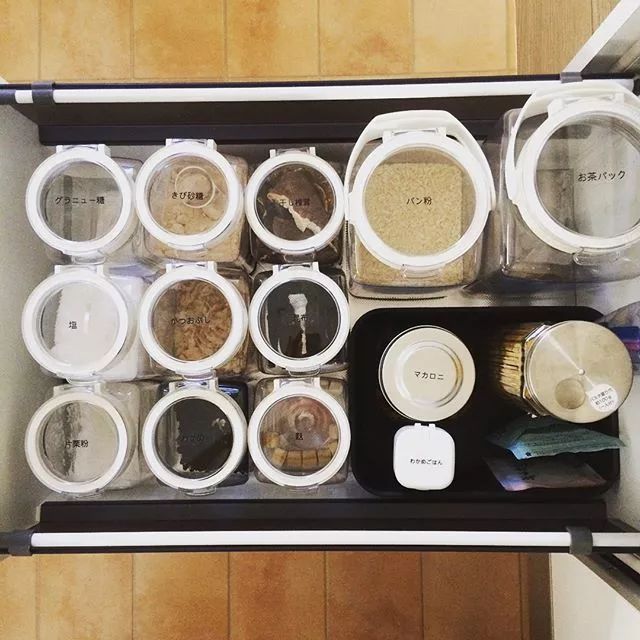 各类调料都用玻璃罐子密封,盖子上标识着名称,美观又整齐~