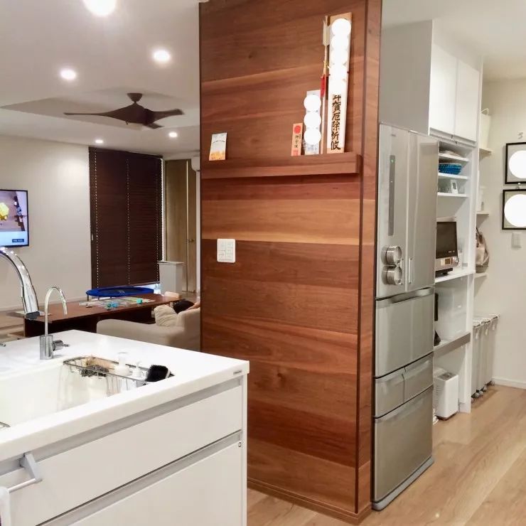 客厅背后的通顶墙柜,就是冰箱、微波炉,和餐具的“隐身地”。(爸妈营微信号:bamaying)