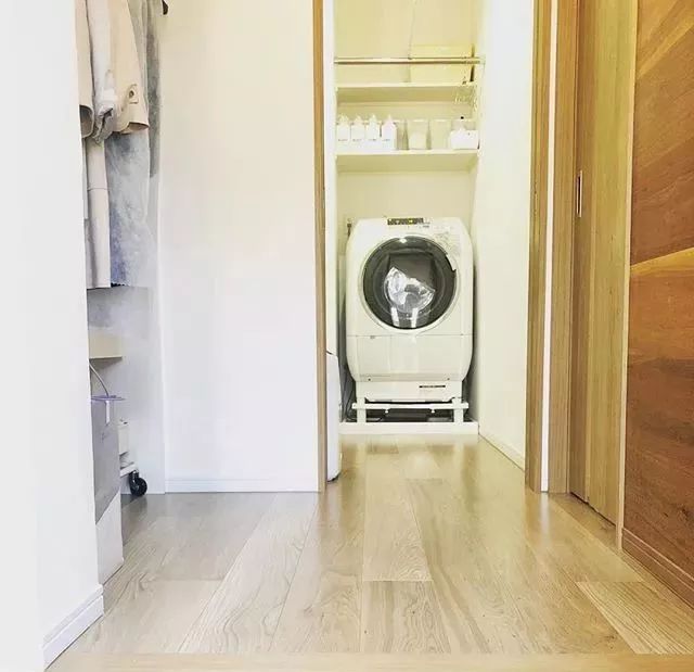 洗衣机旁边的区域是衣帽间。洗完烘干的衣服,可以直接挂在这里。