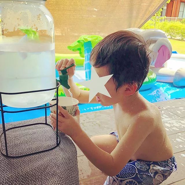 rumi在一旁看着他们玩耍之余,还不忘给他们准备清爽的果汁补充水分: