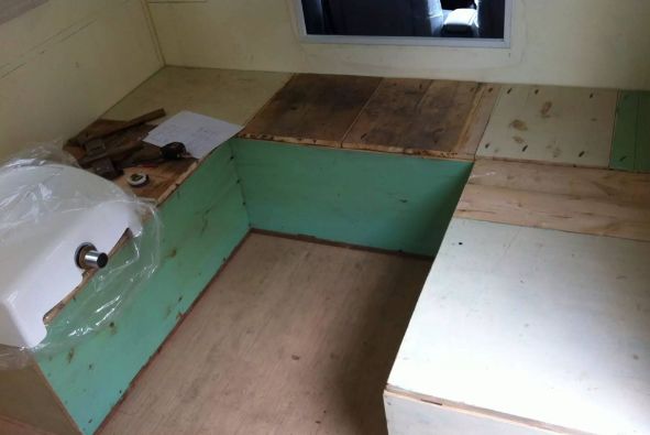房车里的榻榻米是用家里的旧实木柜拼装的,水箱藏在柜子里,节省空间。