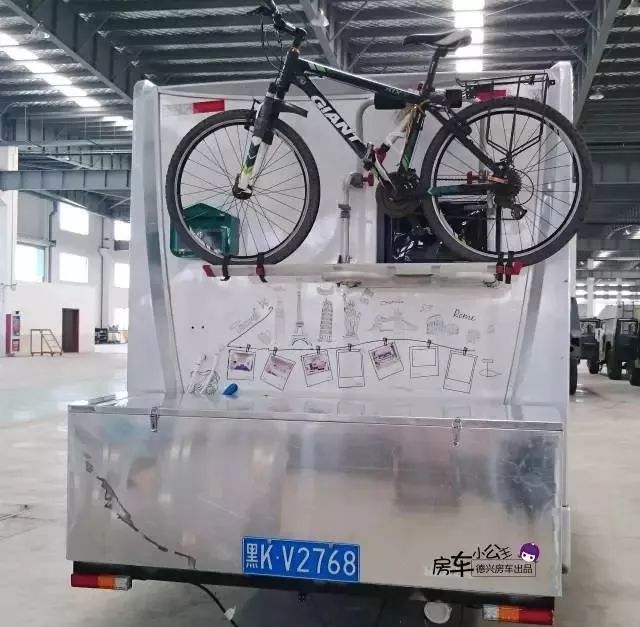 车后的大储物柜可以放置户外用品,随房车携带的山地车,可以在随时随地停下来之后,带着一家人在陌生的地方骑行探险。