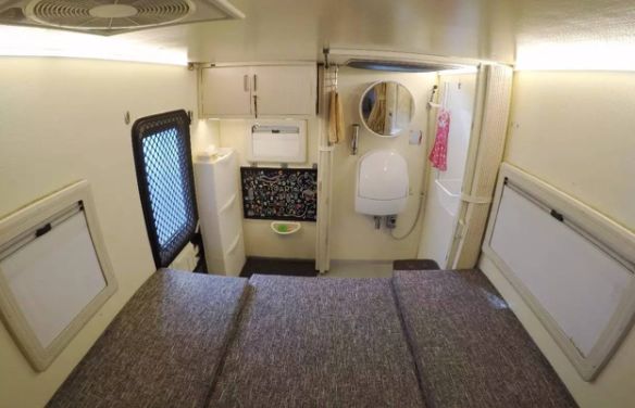 桌子降下来,就是一张床的样子,加上上面铺好的床铺,一辆车里可以有两张床,容纳一家人生活绰绰有余。