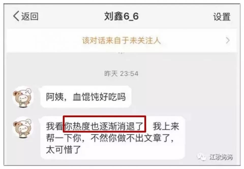 清明节当天,刘鑫先是点赞专业黑江歌妈妈的冷眼萌叔微博“阿姨,血馄饨好吃吗?”。