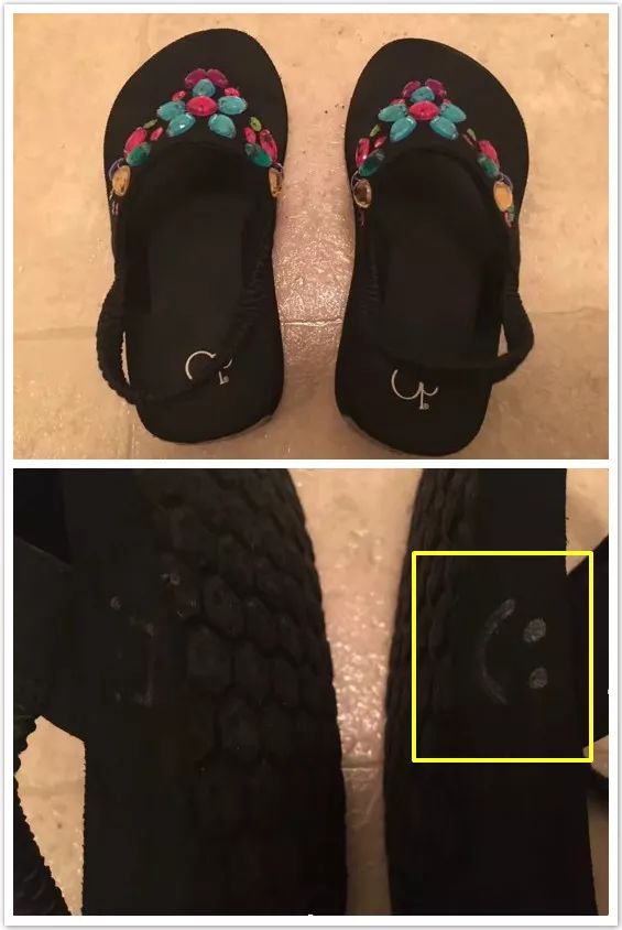 ▲去年夏天女儿穿的凉鞋,凉鞋的两侧被婆婆用永久记号笔画了笑脸