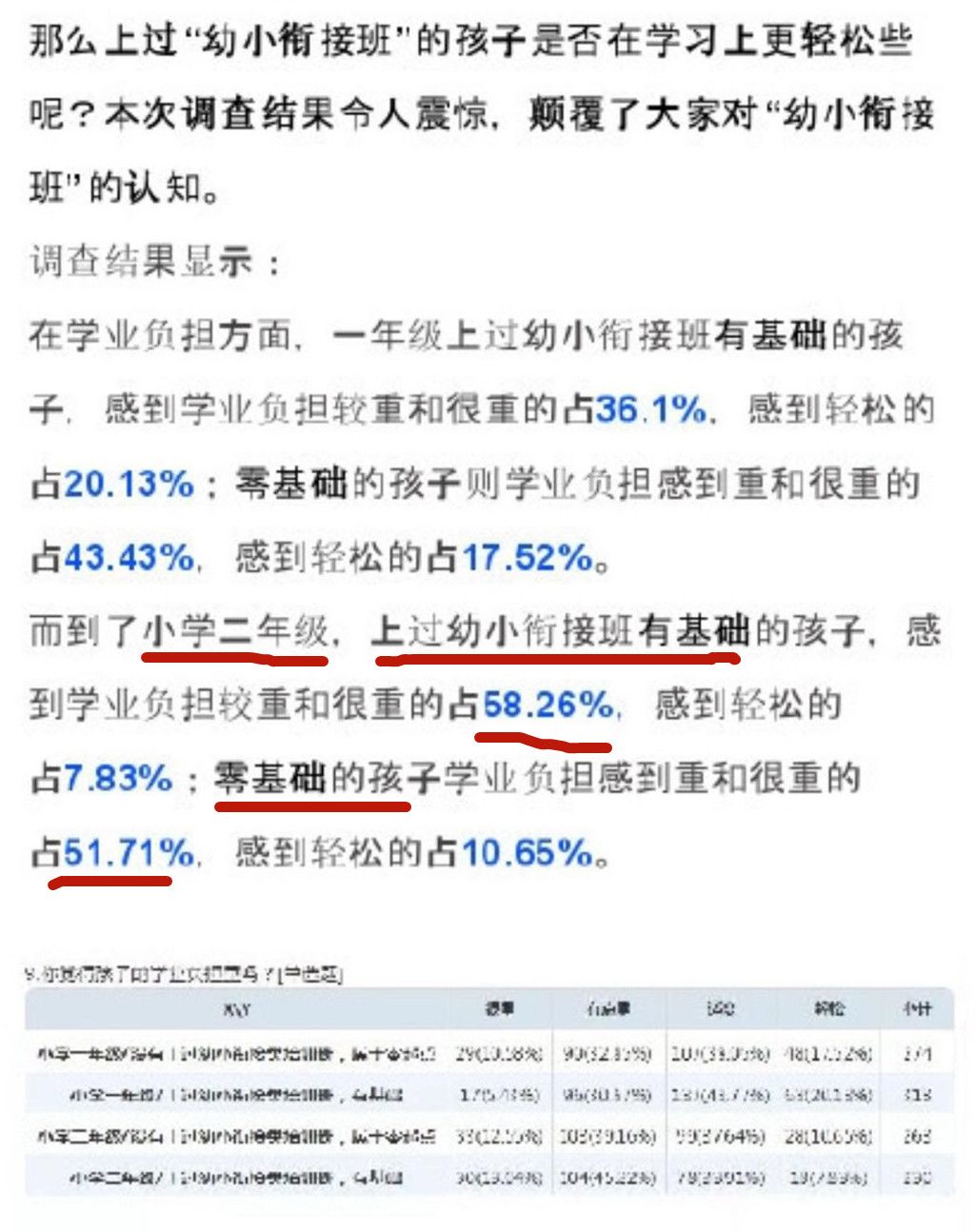 上了幼小衔接班的孩子,在一年级时,学习尚有优势;到了二年级,他们中感到学业负担重的孩子,竟比零基础的孩子高出6.55%。