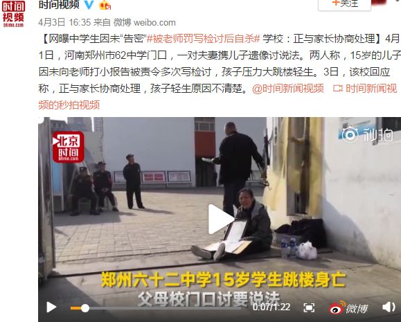 河南郑州学生因未“告密”被逼N次写检讨,最后压力过大选择自杀
