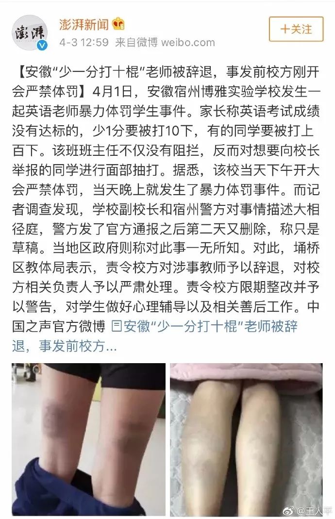 @wodejiuwomeiyoujiu:作为宿州的学生,我是深刻记忆啊! 检查背诵文言文磕巴,被老师拿课本打脸,下雪天被罚到旗杆下站一个小时。全校都看得见!