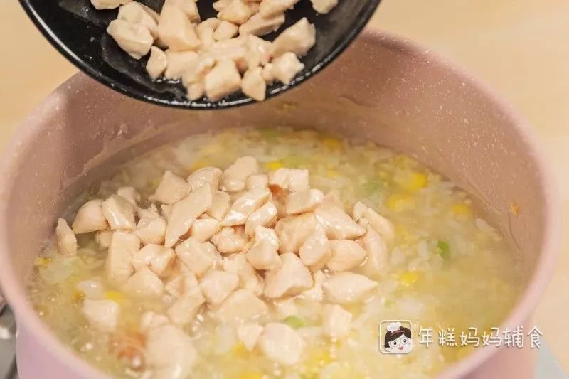 5。杂粮粥煮软烂后,加入炒好的鸡肉丁,再煮3至5分钟;