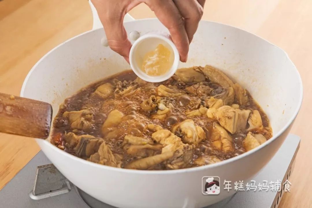 6。大火煮开后加入冰糖,转小火继续盖上锅盖焖10~15分钟左右;(汤汁变成焦糖色就可以了)