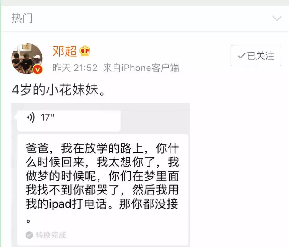 前几天,好久不更博的邓超深夜突然发了一条只有7个字的微博: