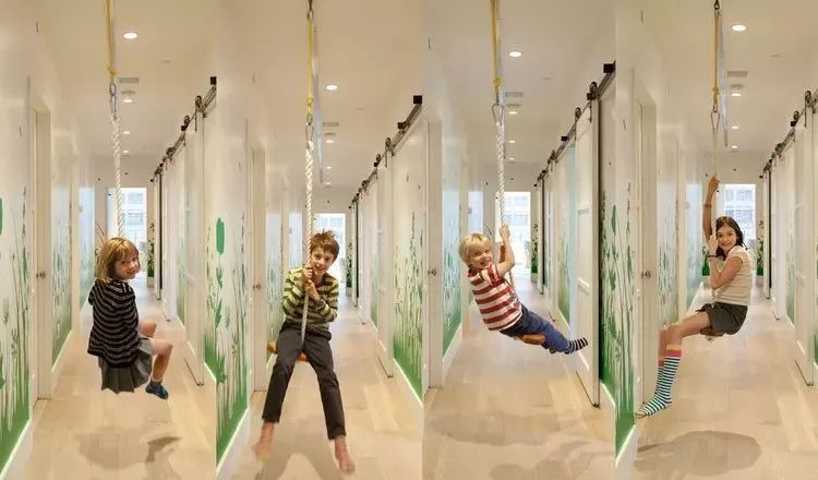 在走廊的顶部,设计师给孩子们做了一个吊索: