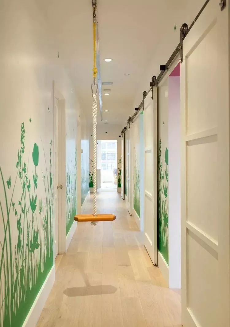 首先,孩子们的房间是连成一排的,走廊两边的墙壁上,按照孩子们的要求画上了各种绿植物。