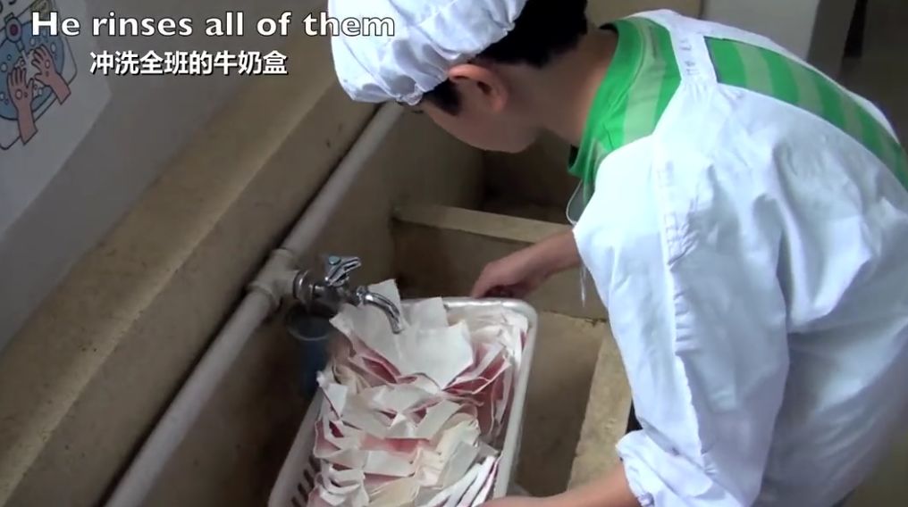 值日生收集大家拆开的牛奶盒,