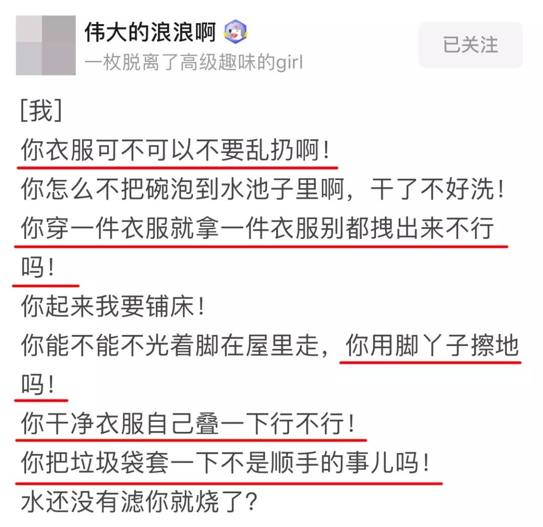 “我做家务的时候,他一直觉得不关他事,我收拾儿子散落一地的玩具,他路过不小心踩到,他用脚跨过去也不弯腰捡一下。”
