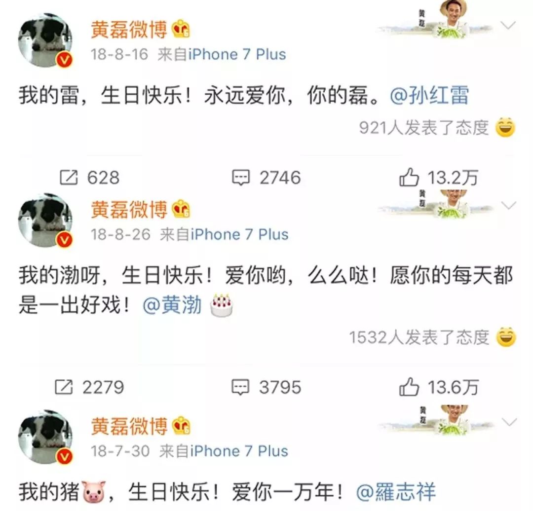 孙红雷、黄渤、罗志祥生日,黄磊都一一送上肉麻的祝福,么么哒+爱你一万年,跟太太都没这么热闹。