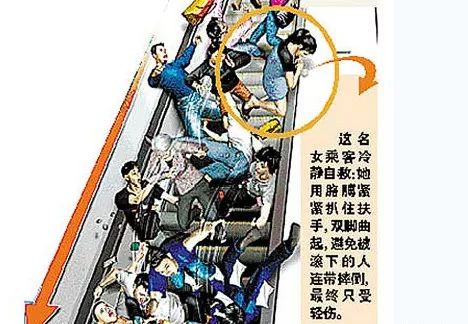 如果遇见了类似的事故,自救方法可以参考曾经北京4号线扶梯事故中女乘客的做法。