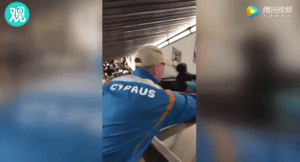 让人心惊的是,后面的妈妈着急地拉着女儿往前跑,女儿趴在电梯上。