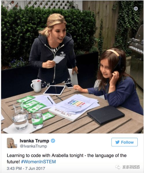 除了择校,课外更是重头戏。阿拉贝拉5岁开始学编程,伊万卡陪着做编程作业。