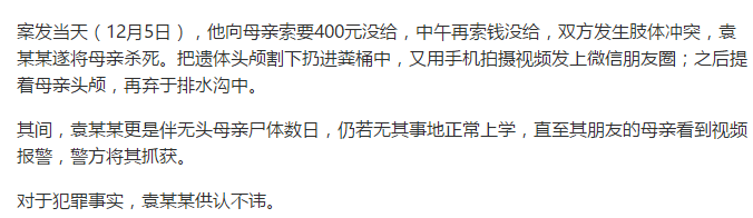 2017年12月5日,四川达州一13岁男孩跟母亲索要400块钱,两次索要不成,发生肢体冲突后,他残忍将母亲杀害。更可怕的是后面的行为,我实在不忍再描述,如图片下方的简述,简直令人头皮发麻。