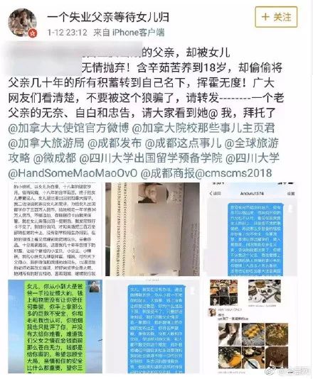 2018年1月12日,一个叫“一个失业父亲等待女儿归”的博主,在新浪微博上悲情哭诉:“我含辛茹苦积攒了300万,却被女儿偷走,挥霍一空。”