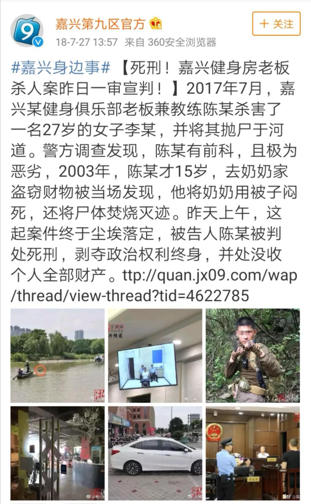 2018年嘉兴某健身房老板陈某因为没钱,忽悠李女士投资进而发生冲突,将其残忍杀害。