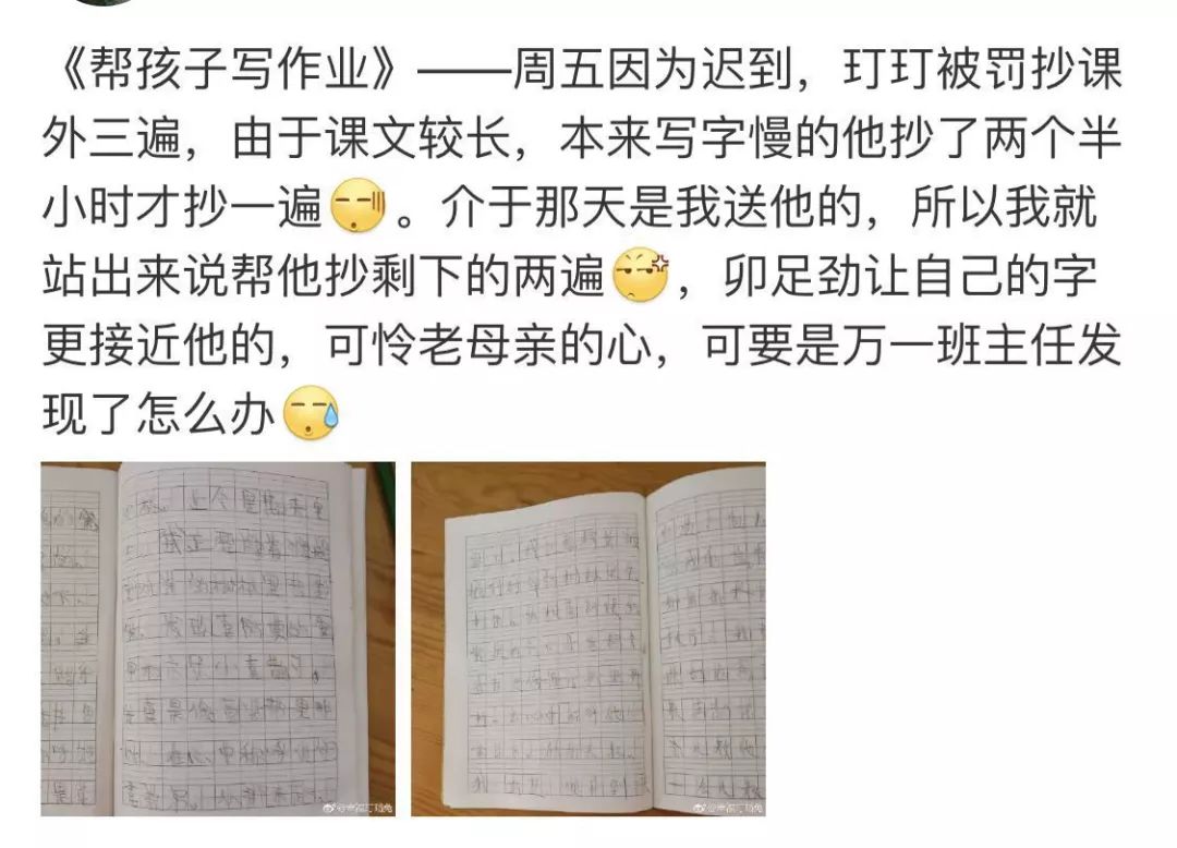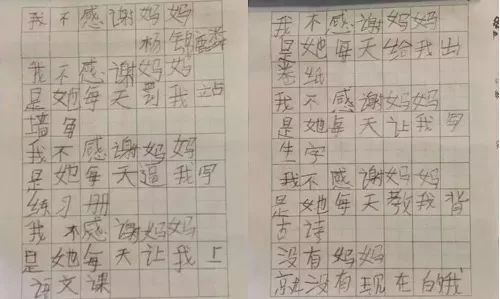 孩子上学迟到了,被罚抄写课文。妈妈心疼孩子抄写了两个半小时才抄了一遍,便自告奋勇站出来,揽下剩下的两遍抄写。