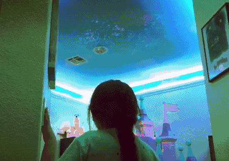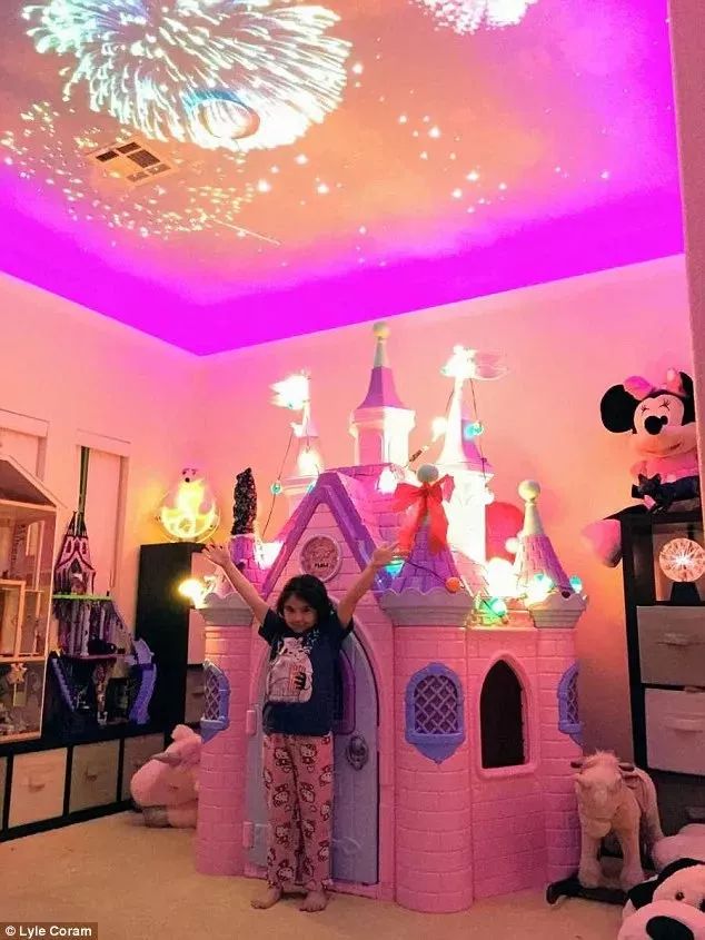 Lyle Coram先要在女儿房间的天花板上画出天空和云彩。然后在天花板上钻出很多很多洞,并把用光纤灯制作的星星一个个装进去。他还弄来一批LED灯,来烘托房间内的整体气氛。当把投影仪和播放器都搞定之后,这一切才算大功告成。