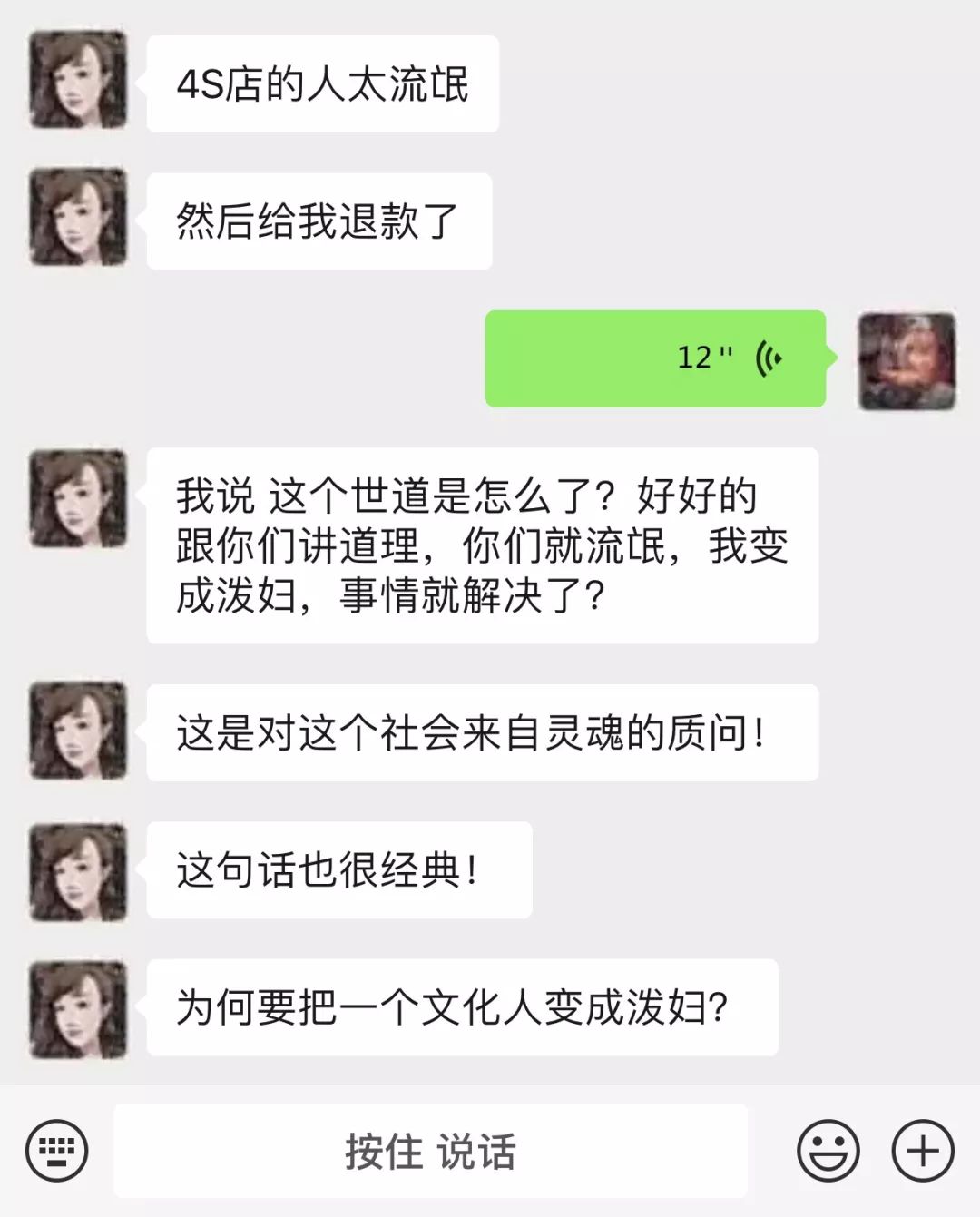 视频热转一天后,算是等来了一个好消息。听说这个女车主已经拿到了本该属于自己的退款,在和好友的聊天记录里,她说了一句可以称为经典的语录。