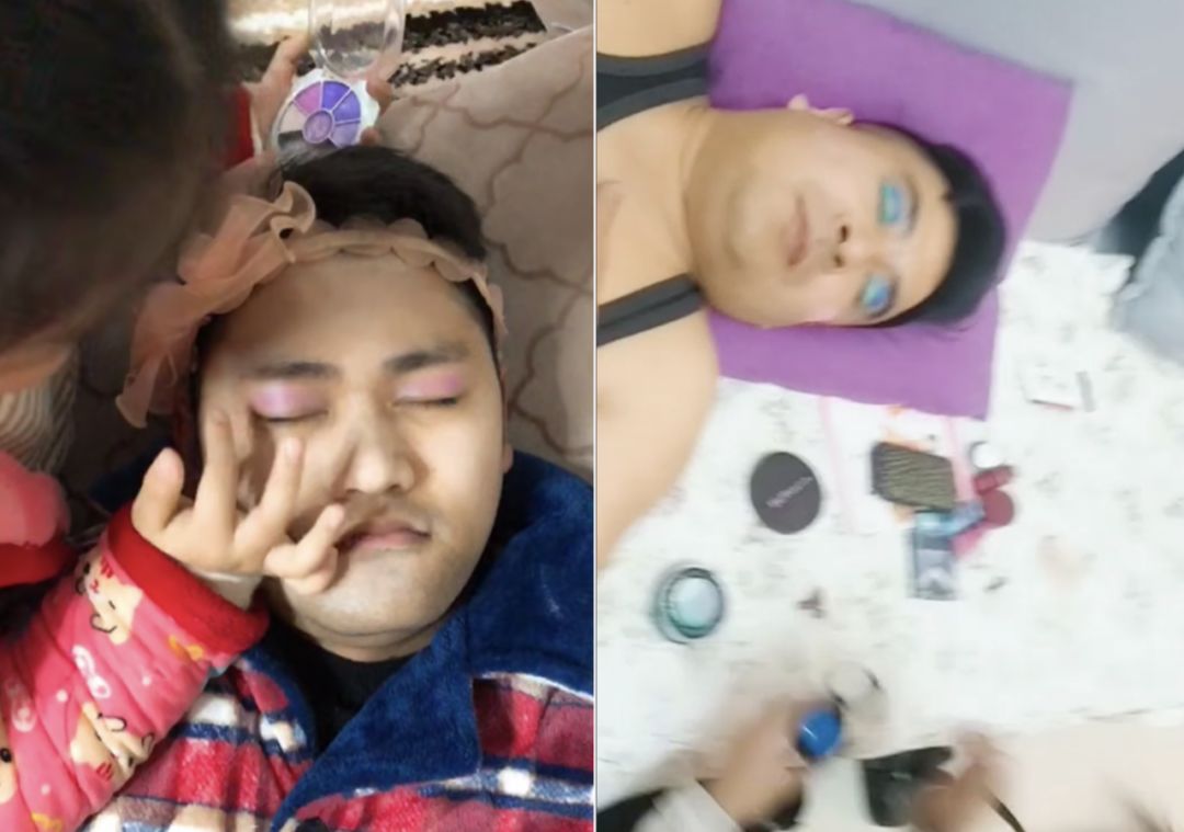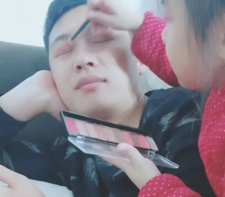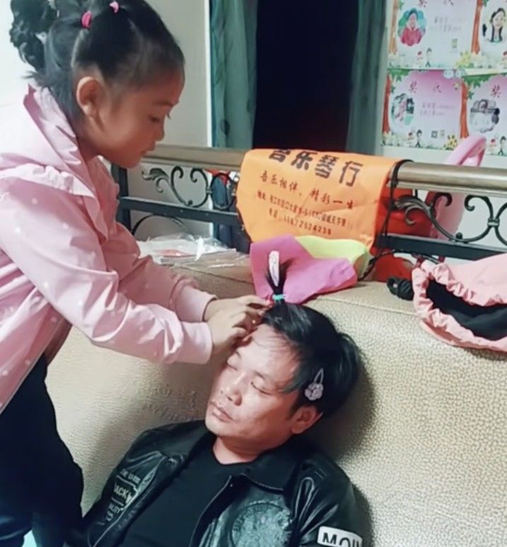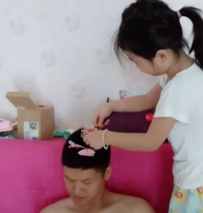 下面这位老爸突然从外地回来,女儿开心地要给老爸化妆。