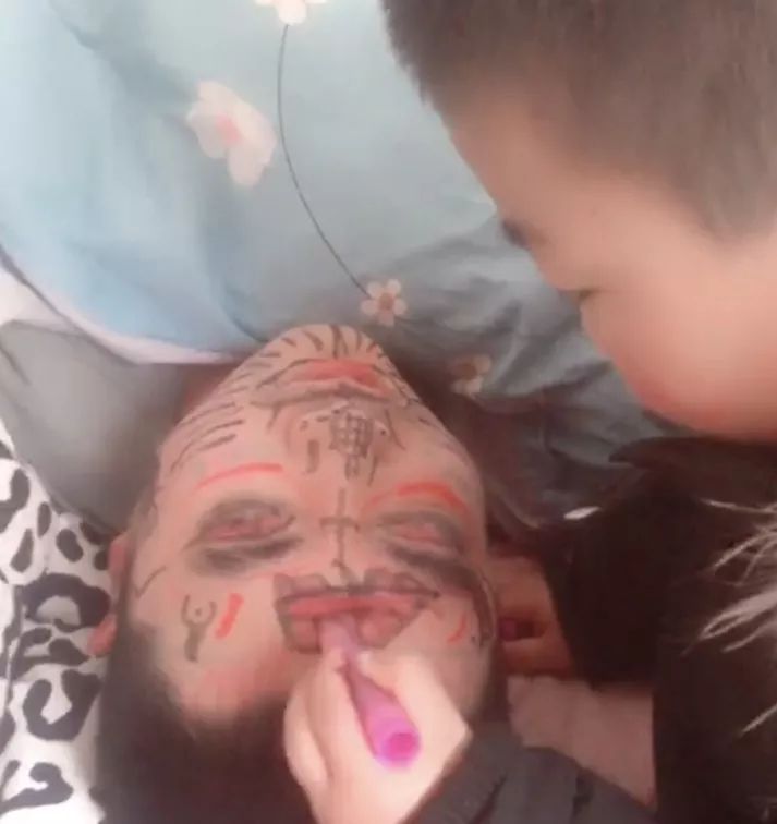 还有这位宝宝,给老爸画了个大花脸,你考虑过摄影师妈妈的感受吗?