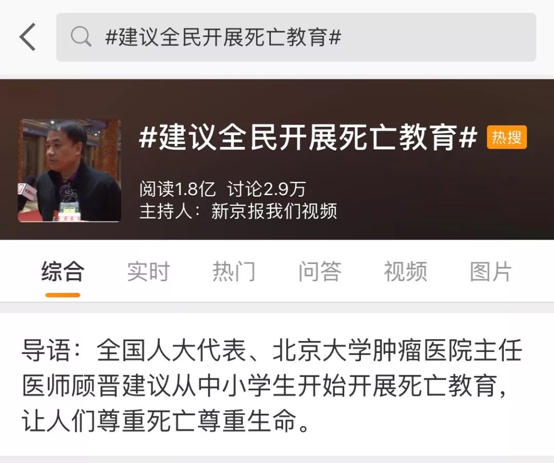 两会上,“建议全民开展死亡教育”这一宝贵提议获得了1.8亿的阅读量。