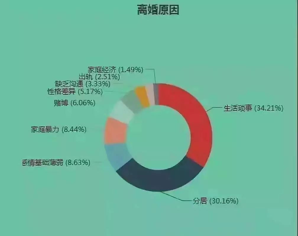 生活琐事还真是现在离婚的第一大原因。浙江高院公布的数字显示,2018年,浙江全省离婚案件中,离婚排名第一的原因是生活琐事,占到了离婚的34.21﹪。