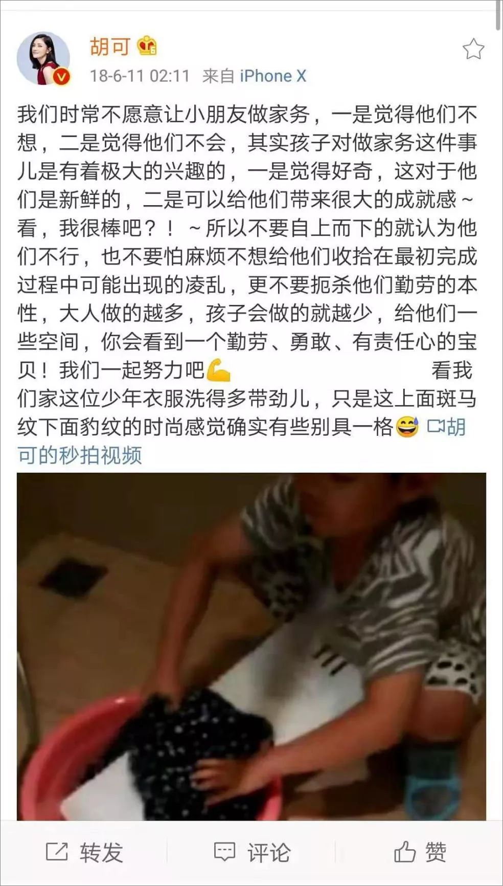 胡可在微博中晒安吉洗衣服时说过,如果给孩子一个做家务机会,就会看到孩子勤劳、勇敢、有责任心的一面!