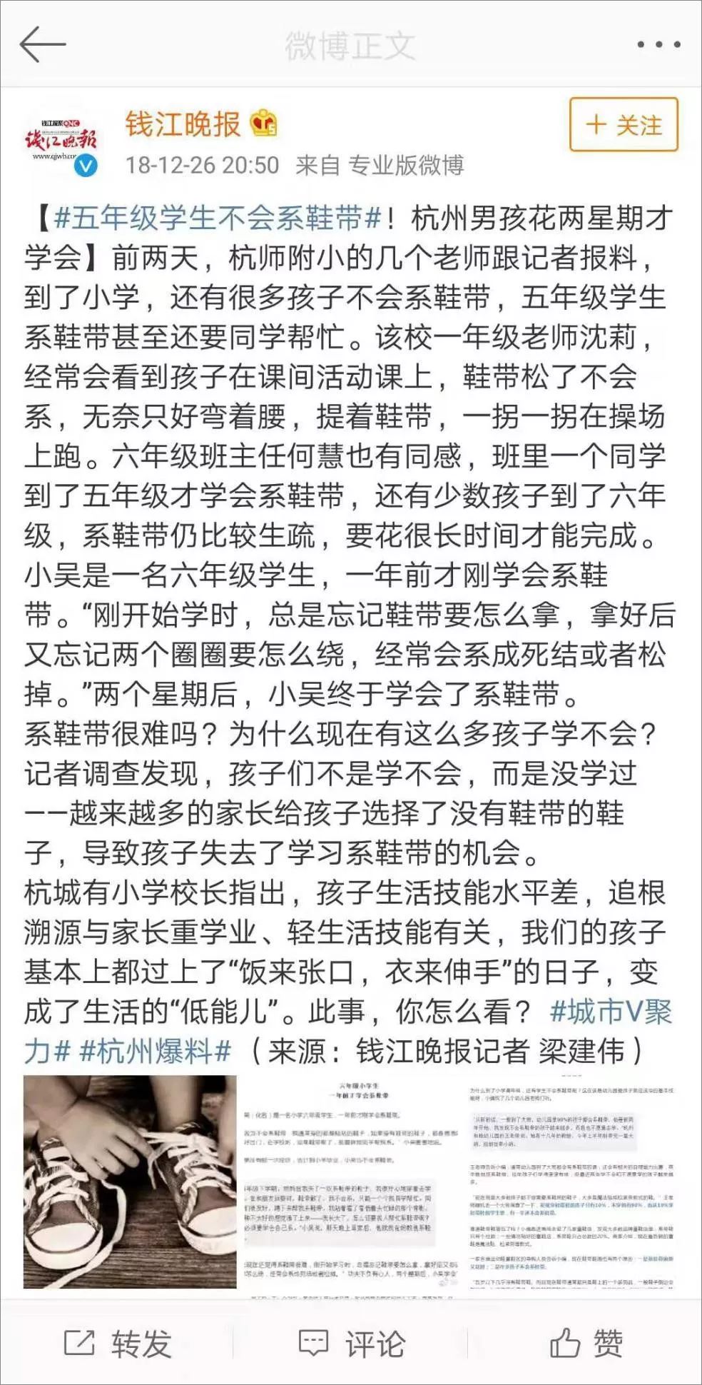 前不久,杭师附小的几个老师跟记者爆料,到了小学,还有很多孩子不会系鞋带。五年级学生系鞋带还要同学帮忙,甚至有的学生到了六年级才学会系鞋带。